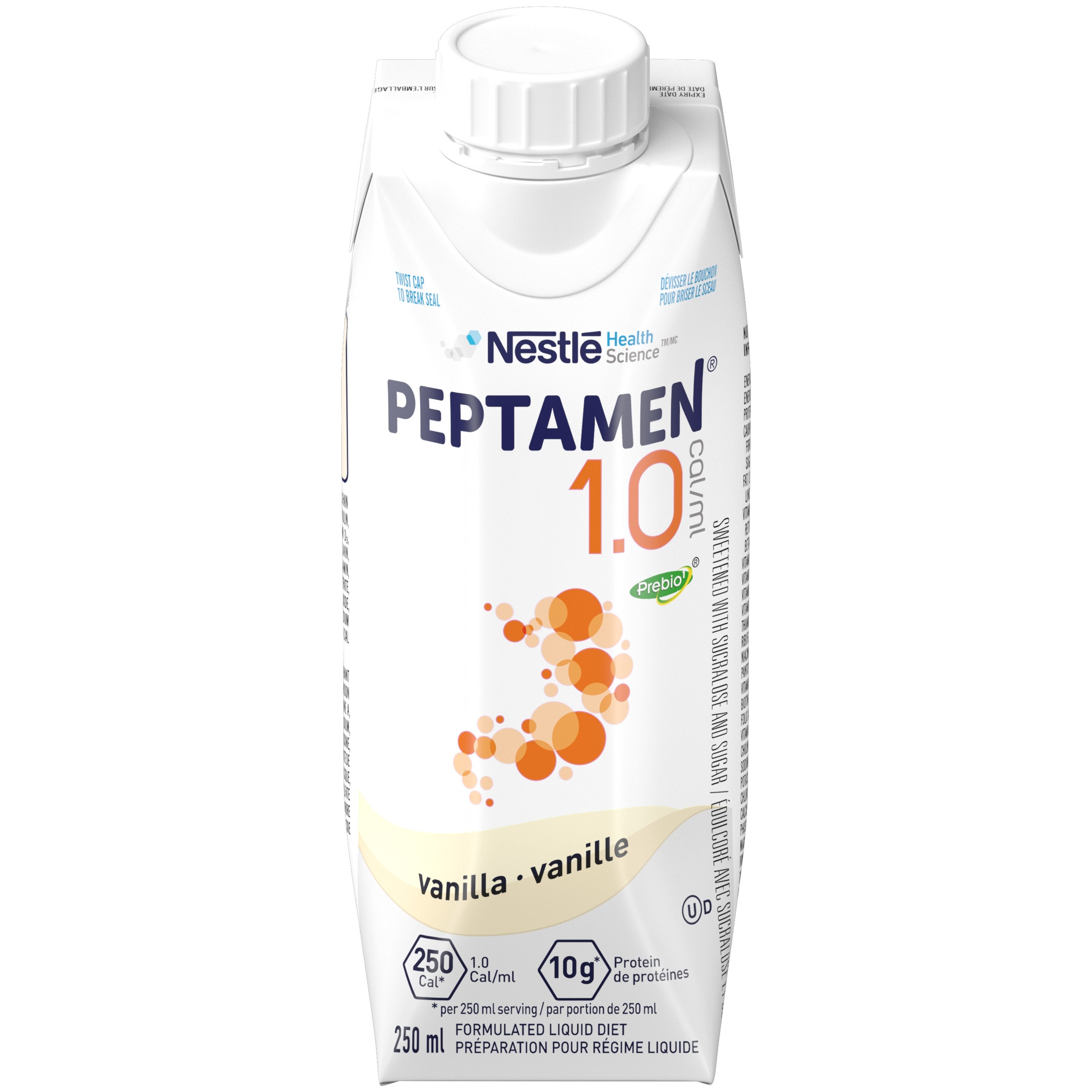 PEPTAMEN® INTENSE 1.0 High Protein is a 1.0 Cal/ml, very high protein, peptide based, 100% whey, 50% MCT formula that supports feeding tolerance. With 37% of calories from protein, Peptamen INTENSE High Protein is formulated to help meet protein needs of patients with elevated requirements. Includes Prebio1TM, a unique blend of dietary fibres, in addition to EPA and DHA. For tube feeding use.